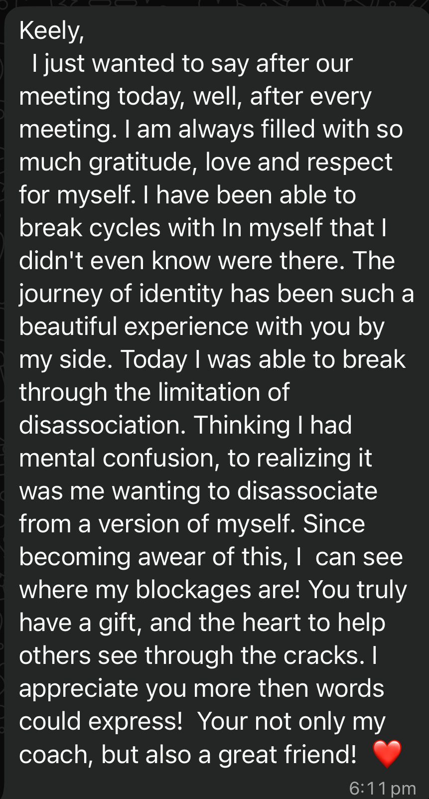 "During the most painful heartbreak of my life, Keely helped me reconnect with myself. Her guidance brought me back to my true identity and inner strength."