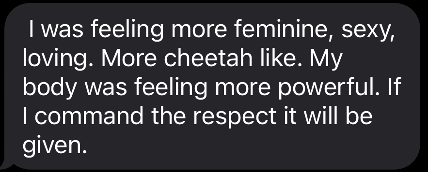 "I am feeling more feminine, sexy, more cheetah like. My body feels more powerful, and I know if I command respect it will be given."