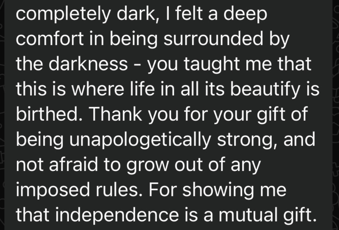 The pilgrimage marked a turning point, awakening a deeper truth: safety doesn’t make a woman small- it allows her to become wild in the right way. Softness is not weakness; it is what allows power to move freely. And when a woman learns to truly listen to herself, her life begins to reorganize around her truth. And maybe the darkness was never a threat… it was an invitation back to the woman I am becoming.